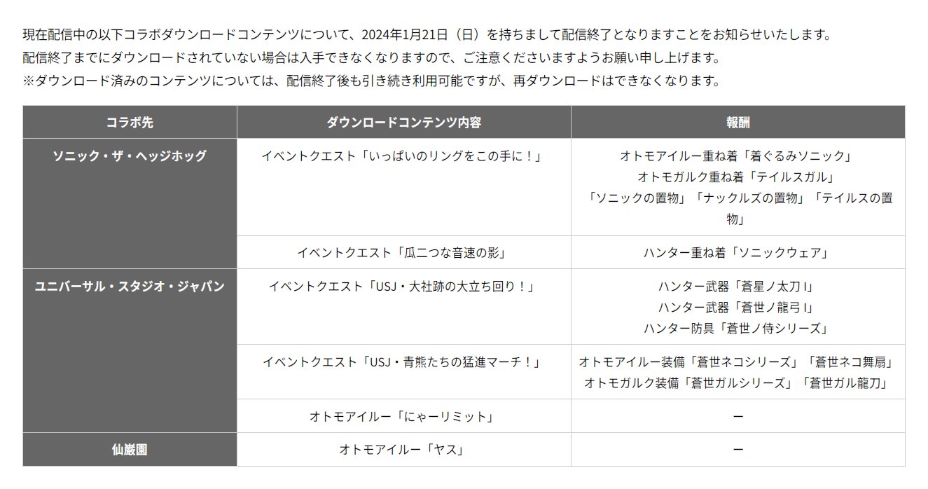 アイスボーンでコラボ終了したのアサクリ/映画モンハンだけでUSJは大丈夫だった気がするけど、サンブレイクだとコラボ終了するんだな